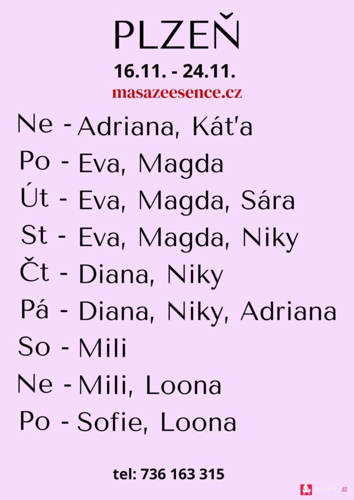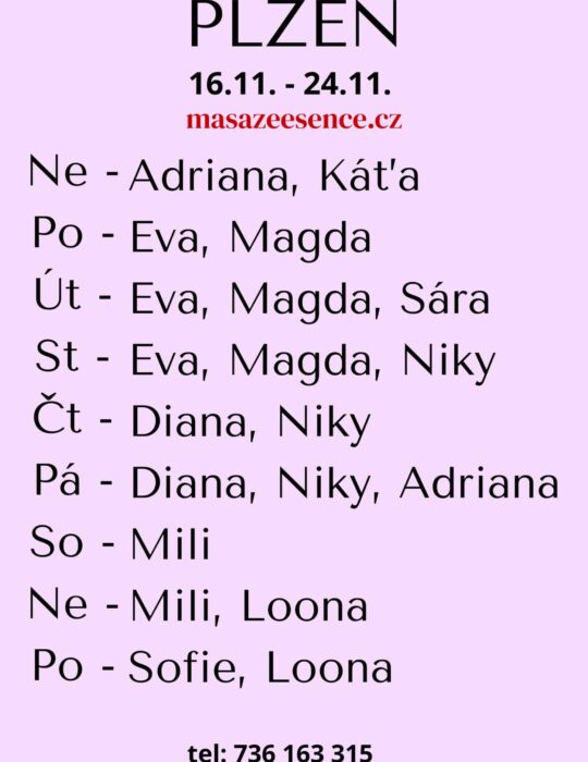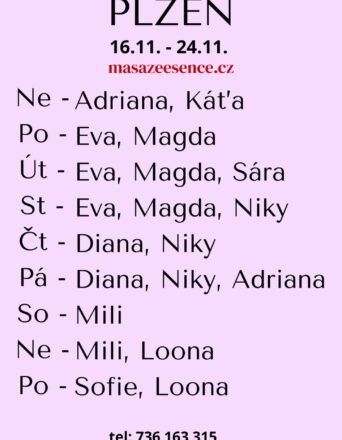 Pro více  informací  volejte: 736163315. Jsem tu pro tebe jen v sobotu 15.-16.11. Vítám vás v salonu MASÁŽE ESENCE. Jsem SMYSLNÁ dívka co vás ráda potěší. JEDNÁ SE O EROTICKOU MASÁŽ S RUČNÍM VYVRCHOLENÍM. Je to velice hravá a intimní masáž do které zapojím nejen své ruce, ale i stehna, zadeček i prsa.Extra masáže: KOUPACÍ RITUÁL, TAJEMNÁ PROSTATA A DALŠÍ. MASÍRUJI CELÁ NAHÁ.  DOPORUČUJI: délku masáže 60min. a z důvodu hlubšího prožitku  90min. www.masazeesence.cz
