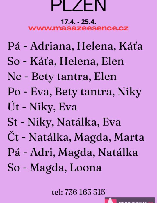 Vítám vás v salonu MASÁŽE ESENCE: www.masazeesence.cz  Jsem SMYSLNÁ dívka co vás ráda potěší. Jsem tu pro tebe od čtvrtka do soboty 23.-25.4. až do 23:00. Extra: lávové kameny, erotická masáž s prvky tantry, zpětná masáž,  masáž prostaty a další. Pro vice informaci volej: 736163315. JEDNÁ SE O EROTICKOU MASÁŽ S PRVKY TANTRY s RUČNÍM VYVRCHOLENÍM. Je to velice hravá a intimní masáž,  do které zapojím nejen své ruce, ale i stehna, zadeček i prsa. MASÍRUJI CELÁ NAHÁ. Postarám se o to, abys změnil každodenní stereotyp a načerpal jsi novou sílu. DOPORUČUJI: délku masáže 60min. a z důvodu hlubšího prožitku  90 min.