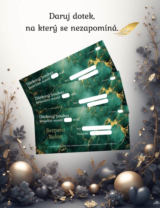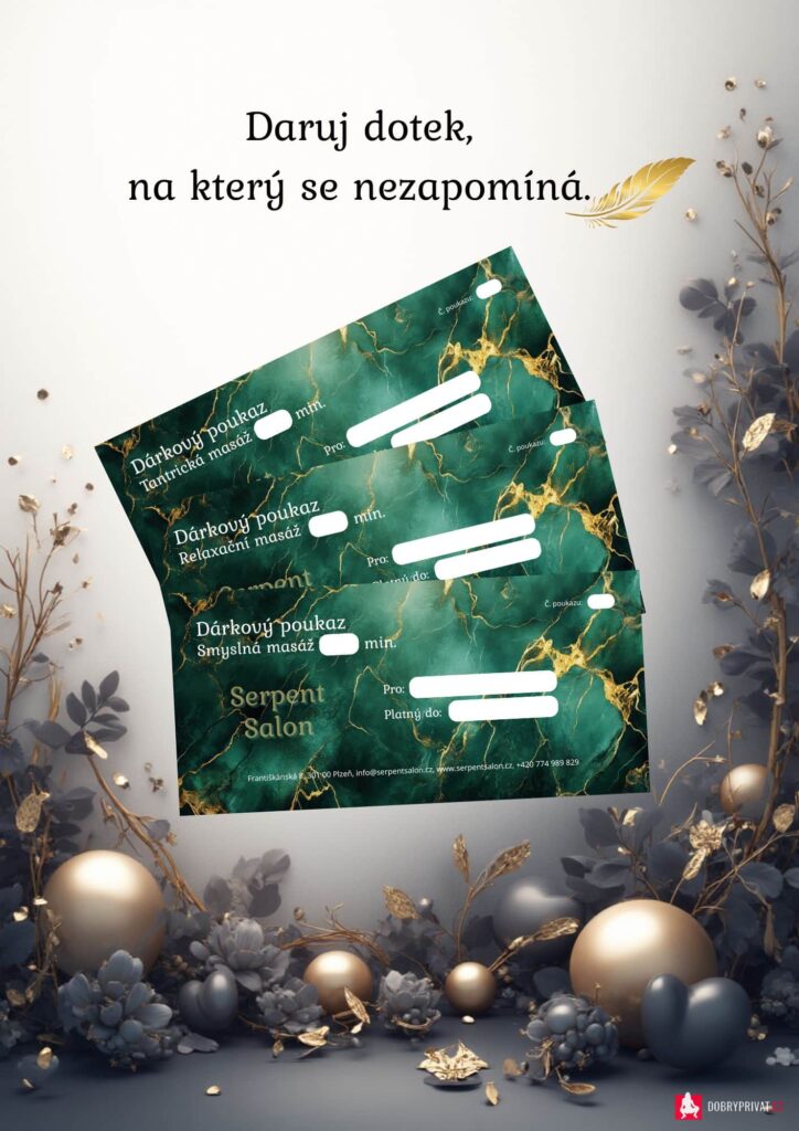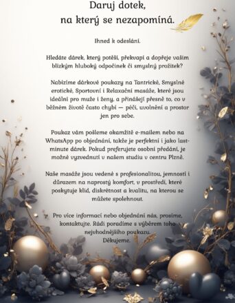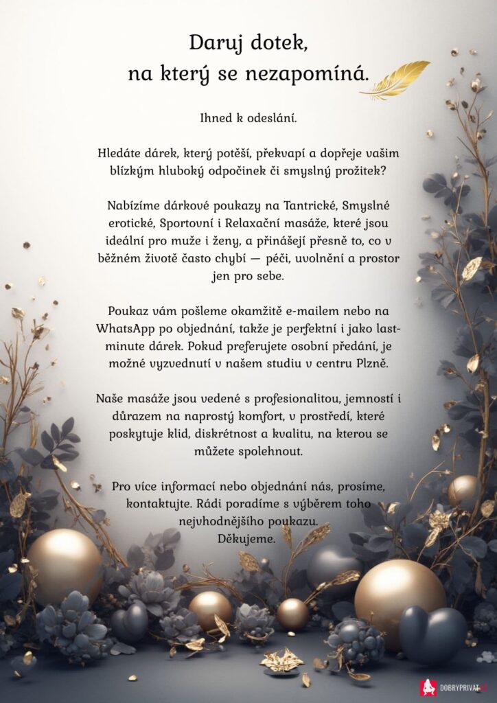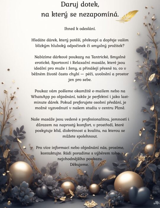 Dárkové poukazy ihned k odeslání na e-mail nebo what’s app. Možnost vyzvednutí osobně. Darujte dotek, na který se nezapomíná.Hledáte dárek, který potěší, překvapí a dopřeje vašim blízkým hluboký odpočinek či smyslný prožitek? Nabízíme dárkové poukazy na Tantrické, Smyslné erotické, Sportovní i Relaxační masáže, které jsou ideální pro muže i ženy, a přinášejí přesně to, co v běžném životě často chybí — péči, uvolnění a prostor jen pro sebe. Poukaz vám pošleme okamžitě e-mailem po objednání, takže je perfektní i jako last-minute dárek. Pokud preferujete osobní předání, je možné vyzvednutí v našem studiu v centru Plzně. Naše masáže jsou vedené s profesionalitou, jemností i důrazem na naprostý komfort, v prostředí, které poskytuje klid, diskrétnost a kvalitu, na kterou se můžete spolehnout. Pro více informací nebo objednání nás prosíme kontaktujte. Rádi poradíme s výběrem toho nejvhodnějšího poukazu. Dekujeme.