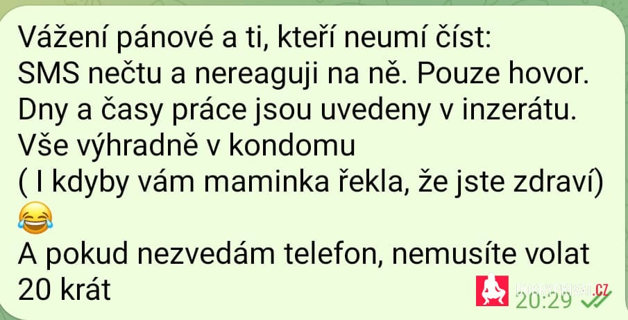 Zdravím vás pánové)Vím, jak splnit vaše sny. Domluva jen telefonická, na SMS nereaguji a nekoresponduji.Neposílám fotky ani videa.Pokud hledáš příjemnou holku, tak si na správné adrese. Tak se přijď zastavit na vášnivou chvíli, jsem usměvavá a přítulná. Zaručuji ti diskrétnost, pohodu a kamarádský přístup. Pro gurmány!.! skvělá nabídka Budu se moc těšit na tvojí společnost.Všechny sny se splní)))