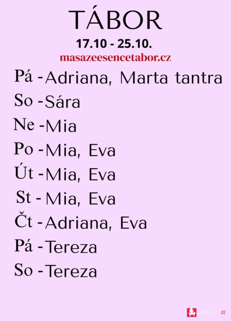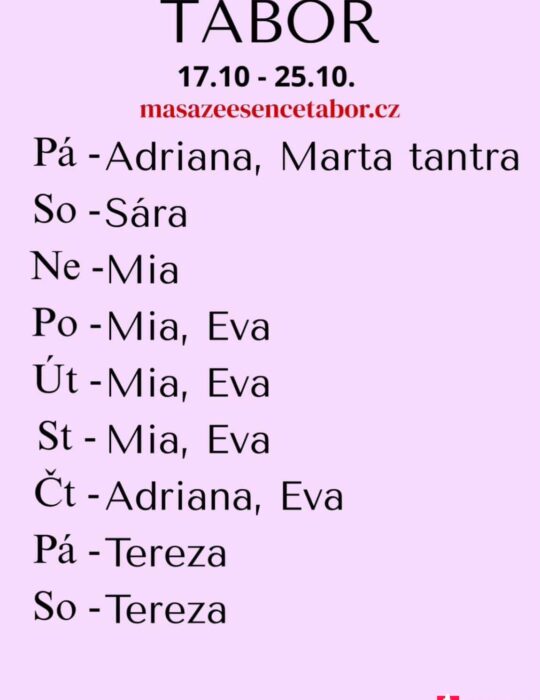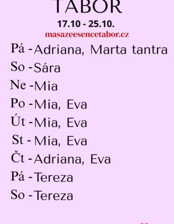 Jsem tu pro tebe OD NEDĚLE DO STŘEDY 19.-22.10. . Vítám vás v salonu MASÁŽE ESENCE. Jsem SMYSLNÁ dívka co vás ráda potěší...  JEDNÁ SE O EROTICKOTANTRICKOU MASÁŽ S RUČNÍM VYVRCHOLENÍM. Je to velice hravá a intimní masáž. Pro více informací volej: 770 659 827 nebo 777 327 634. DOPORUČUJI: délku masáže 60min. a z důvodu hlubšího prožitku  90min. www.masazeesencetabor.cz