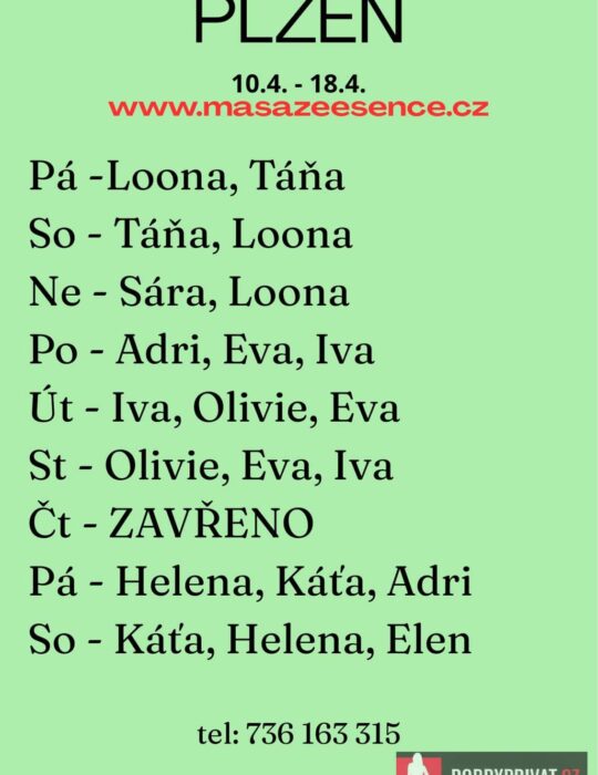 Vítám vás v salonu MASÁŽE ESENCE, www.masazeesence.cz. Jsem tu pro tebe v  neděli 12.4.   Pro více  informací volejte na tel.č. 736163315.  Jsem SMYSLNÁ dívka co vás ráda potěší. JEDNÁ SE O EROTICKOU MASÁŽ S RUČNÍM VYVRCHOLENÍM.  Je to velice hravá a intimní masáž, do které zapojím nejen své ruce, ale i stehna, zadeček i prsa.  MASÍRUJI CELÁ NAHÁ.  .DOPORUČUJI: koupací rituál, BDSM doft a další …. délku masáže 60min. a z důvodu hlubšího prožitku  90min., nebo 120min. Tel. 736163315    www.masazeesence.cz