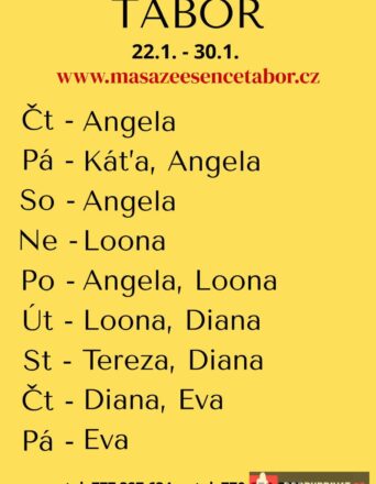 Vítám vás v salonu MASÁŽE ESENCE, www.masazeesencetabor.cz. JSEM TU PRO TEBE : v pondělí  26.1 . Jsem smyslná dívka ANGELA co vás ráda potěší. Extra: footjop, tajemná prostata a další. Pro více informací volejte: 777327634 nebo 770659872. JEDNÁ SE O  EROTICKOU MASÁŽ.  Je to velice hravá a intimní masáž, do které zapojím nejen své ruce, ale i stehna, zadeček i prsa. DOPORUČUJI: délku masáže 60  min. a z důvodu hlubšího prožitku délku 90min. www.masazeesencetabor.cz