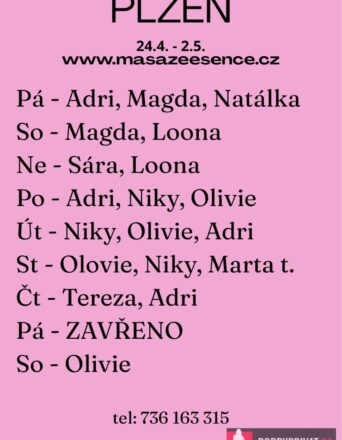 Vítám vás v salonu MASÁŽE ESENCE: www.masazeesence.cz  Jsem SMYSLNÁ žena co vás ráda potěší. Extra: koupací rituál, masáž lingamu, pozice 69 a další. Jsem tady pro tebe od pondělí do středy 27.-29.4. až do 23:00. Pro více informací volejte: 736163315. JEDNÁ SE O EROTICKOU MASÁŽ S RUČNÍM VYVRCHOLENÍM.  Je to velice hravá a intimní masáž, do které zapojím nejen své ruce, ale i stehna, zadeček i prsa. MASÍRUJI CELÁ NAHÁ.  DOPORUČUJI: délku masáže 60min. a z důvodu hlubšího prožitku  90min.