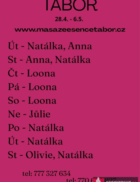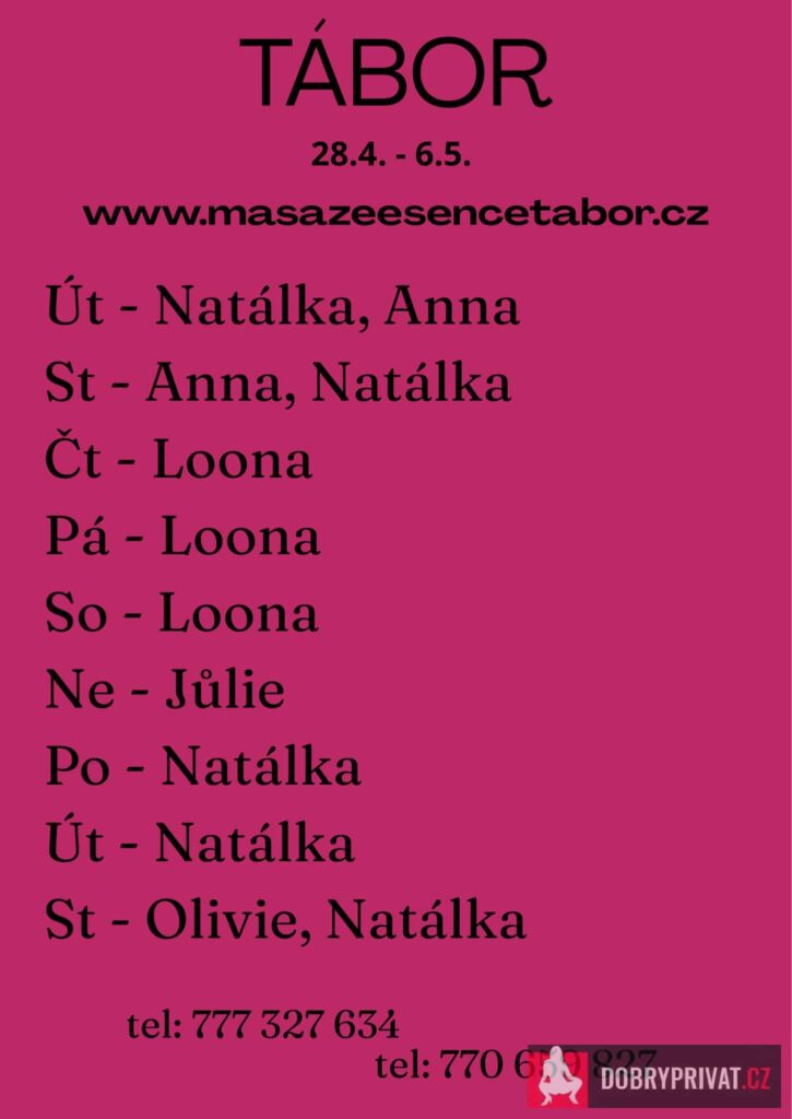 Májová akce: SLEVA 300,-  Vítám vás v salonu MASÁŽE ESENCE, www.masazeesencetabor.cz. Jsem tu pro TEBE jen v neděli 3.5. Pro více informací volejte: 770659827 nebo   777327634. Jedná se o EROTICKOU MASÁŽ. Tím to vás zvu do světa uvolnění a jemné smyslnosti. Extra: koupací rituál, footjob, masáž prostaty a další…….  Vzájemná úcta je v mé práci důležitá k navázání společného intimního vztahu.❤️ DOPORUČUJI: délku masáže 60 min. nebo pro zajímavější zážitek 90 min. JEDNÁ SE O EROTICKOU MASÁŽ S RUČNÍM ZAKONČENÍM.