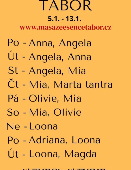 Vítám vás v salonu MASÁŽE ESENCE, www.masazeesencetabor.cz  EROTICKÁ MASÁŽ OD Adriay. Pro více informací volejte 770 659 827 nebo 777327634.Jsem tu pro vás jen v PONDĚLÍ 12.1. Extra:B2B, tajemná prostata, masáž nohami a další. Přijeďte prožít jedinečnou EROTICKOU masáž, která vás dostane do stavů nepopsatelnych, ty se musí prožít!  Čekají vás jemné doteky a velké vzrušení. TĚŠÍM SE NA VÁS ♥️