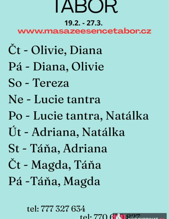 Vítám vás v salonu MASÁŽE ESENCE, www.masazeesencetabor.cz. JSEM TU PRO TEBE  Jen v sobotu 21.3. Jsem smyslná dívka co vás ráda potěší. Extra: masáž prostaty, footjob, BDSM  soft a další. Pro více informací volejte: 777327634 nebo 770659827. JEDNÁ SE O  EROTICKOU MASÁŽ.  Je to velice hravá a intimní masáž, do které zapojím nejen své ruce, ale i stehna, zadeček i prsa. DOPORUČUJI: délku masáže 60 min. a z důvodu hlubšího prožitku délku 90 min. www.masazeesencetabor.cz