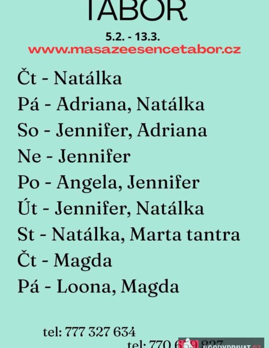 Vítám vás v salonu MASÁŽE ESENCE, www.masazeesencetabor.cz. JSEM TU PRO TEBE JEN V ÚTERÝ  A VE STŘEDU 3.-4.3. Jsem smyslná dívka co vás ráda potěší. Extra:erotická masáž, footjob, tajemná prostata, BDSM soft a další. Pro více informací volejte:  777327634. JEDNÁ SE O  EROTICKOU MASÁŽ.  Je to velice hravá a intimní masáž, do které zapojím nejen své ruce, ale i stehna, zadeček i prsa. DOPORUČUJI: délku masáže 60  min. a z důvodu hlubšího prožitku délku 90min. www.masazeesencetabor.cz